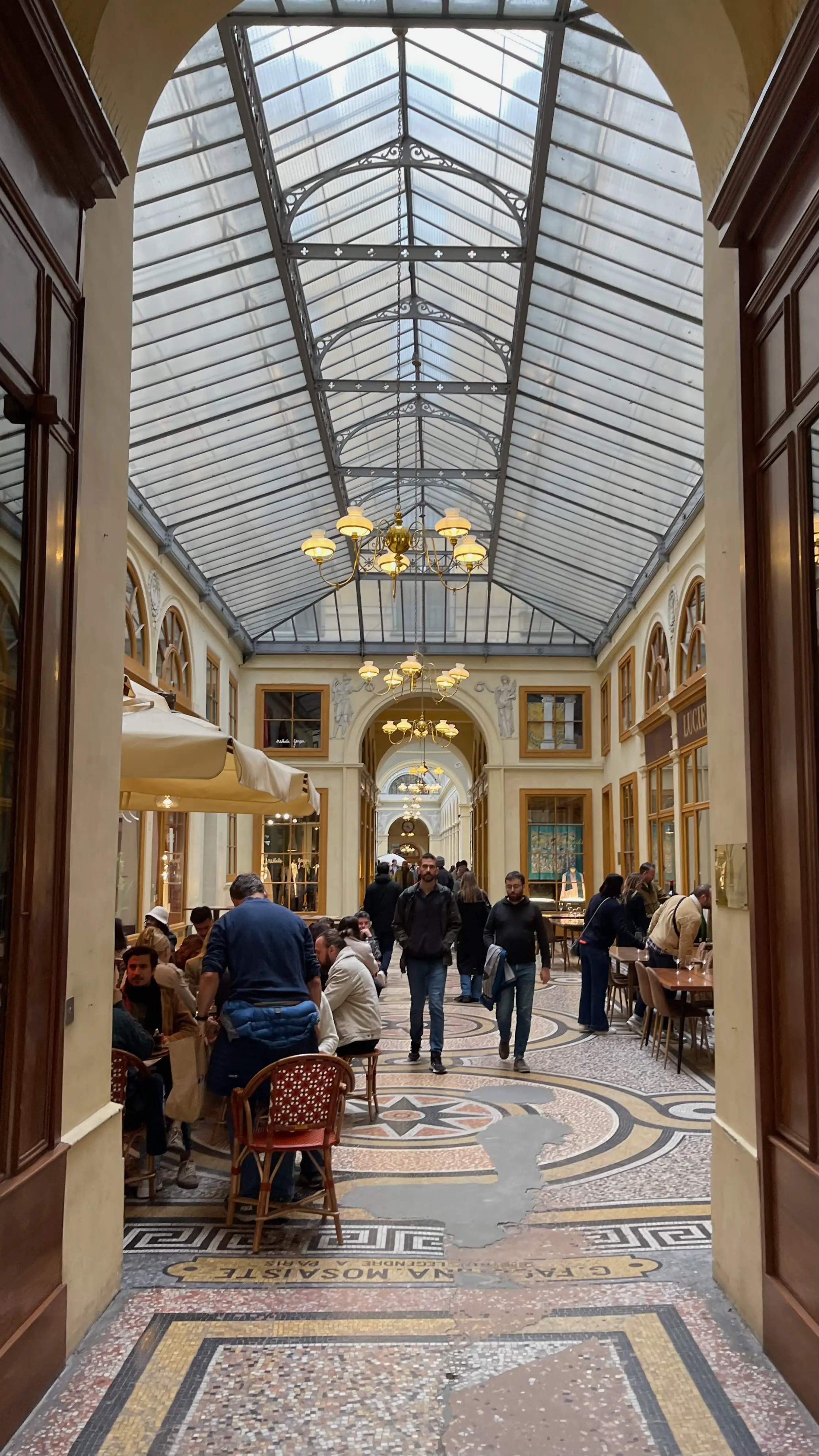 Our morning stroll naturally led us to Galerie Vivienne, one of Paris’s most beautiful covered passages and an absolute must-see for anyone wanting to discover elegant 19th-century Paris. Inaugurated in 1823, this gallery, a classified Historic Monument, immediately captivates with its luminous glass roof, geometric mosaic floor, and perfectly preserved neoclassical decorations.